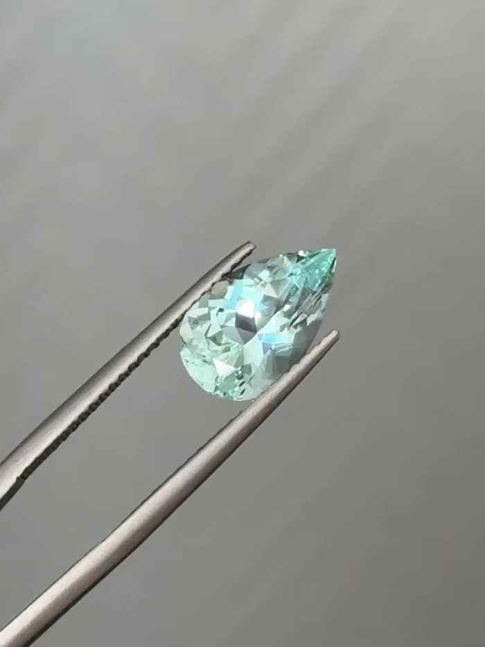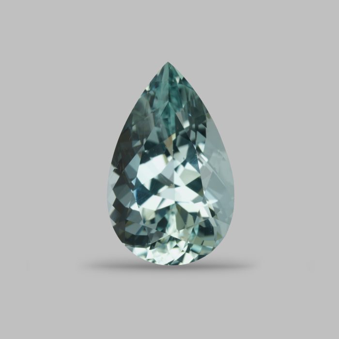 Зеленовато-голубой аквамарин в традиционной огранке. Мы переполировали камень для лучшего блеска и симметрии, но рисунок оставили – он хорошо подходит для светлых камней.