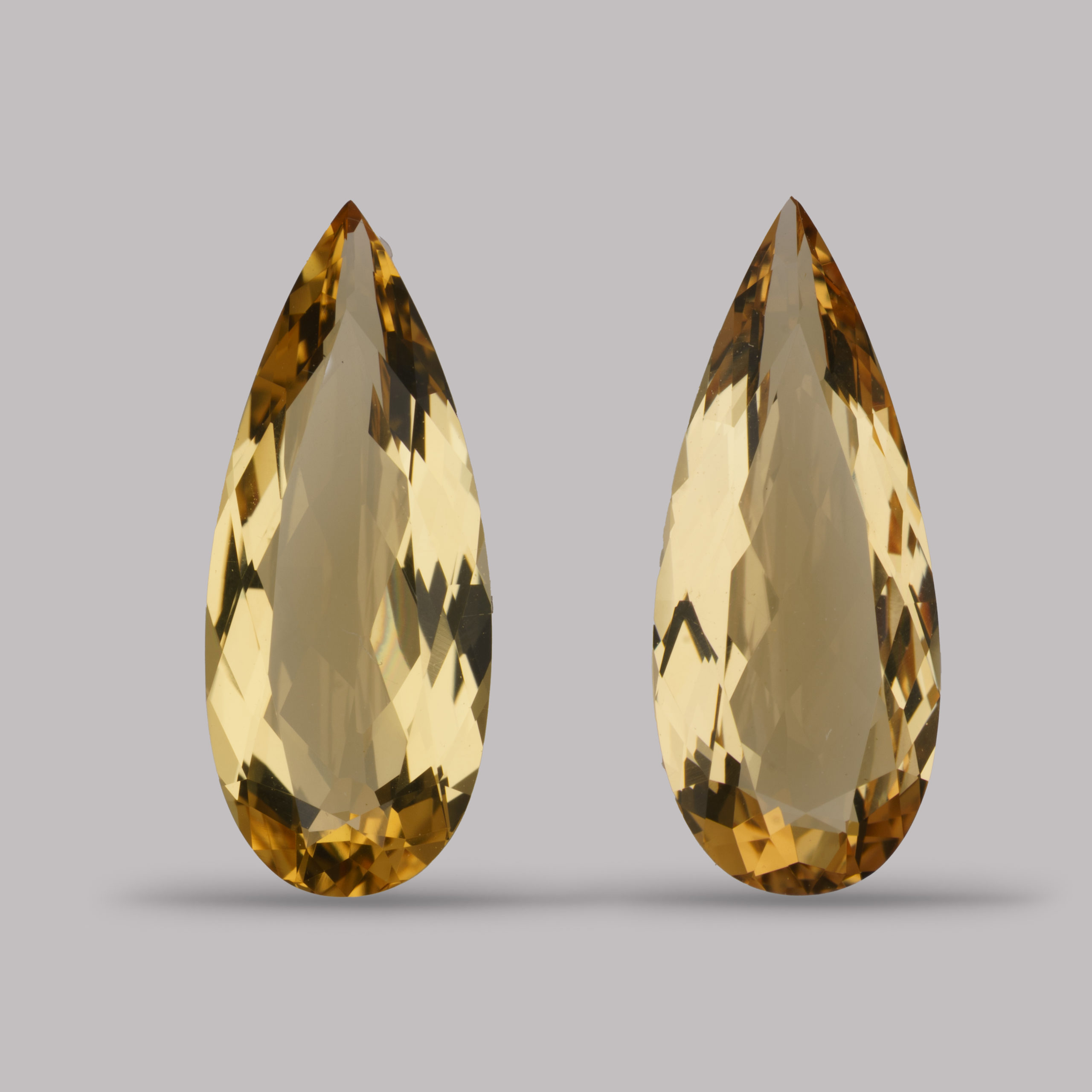 Пара берилловых груш в традиционной для Бразилии огранке, очень длинные и плоские. Мы переполировали камни, но с “окнами” сделать ничего не смогли.