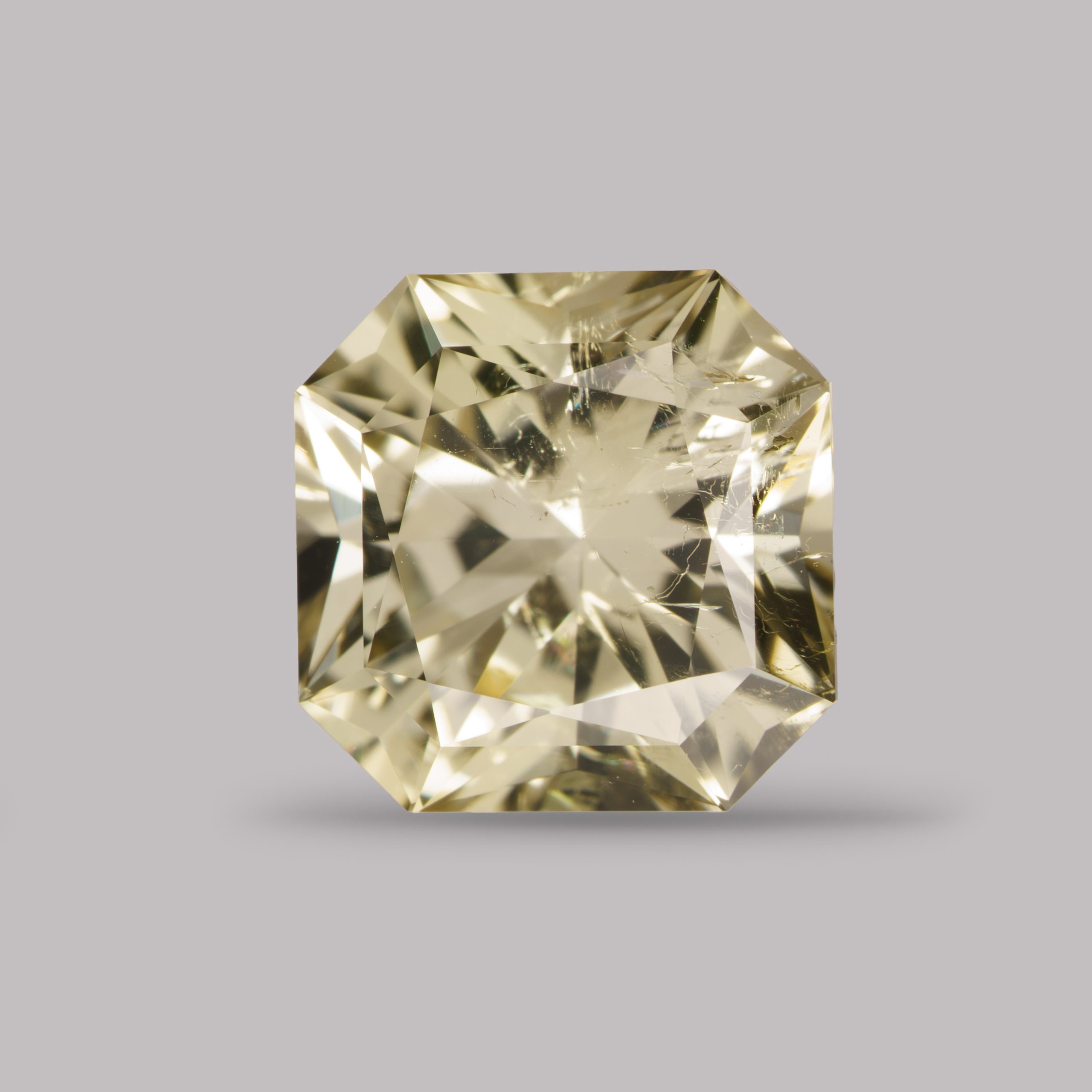 Золотистый берилл в огранке радиант. Включения, видимые на фото, глазом не заметны.
