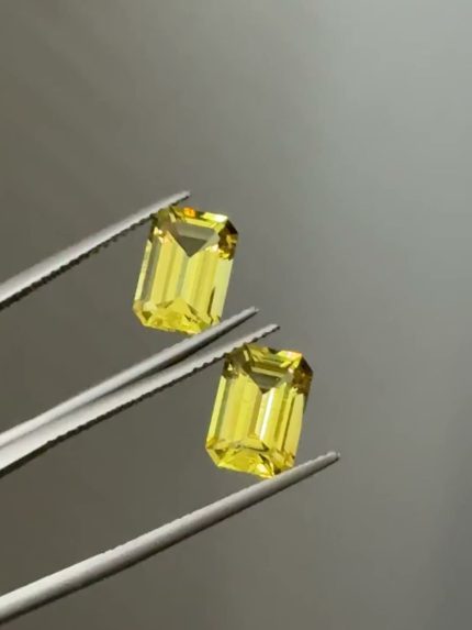 Пара медовых гелиодоров в правильной огранке и с отличной для месторождения чистотой. Вертикальные полосы – не включения, а ростовая зональность.