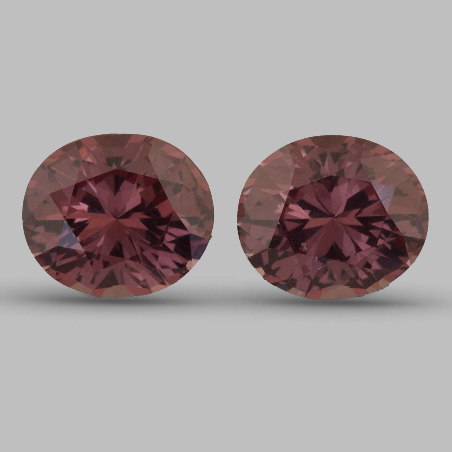 Пара камней в нашей качественной огранке, что для этой разновидности мягко говоря не характерно. В тёплом электрическом свете или при свечах переходят из основного сложного коричнево-розового оттенка в более яркий ягодный.