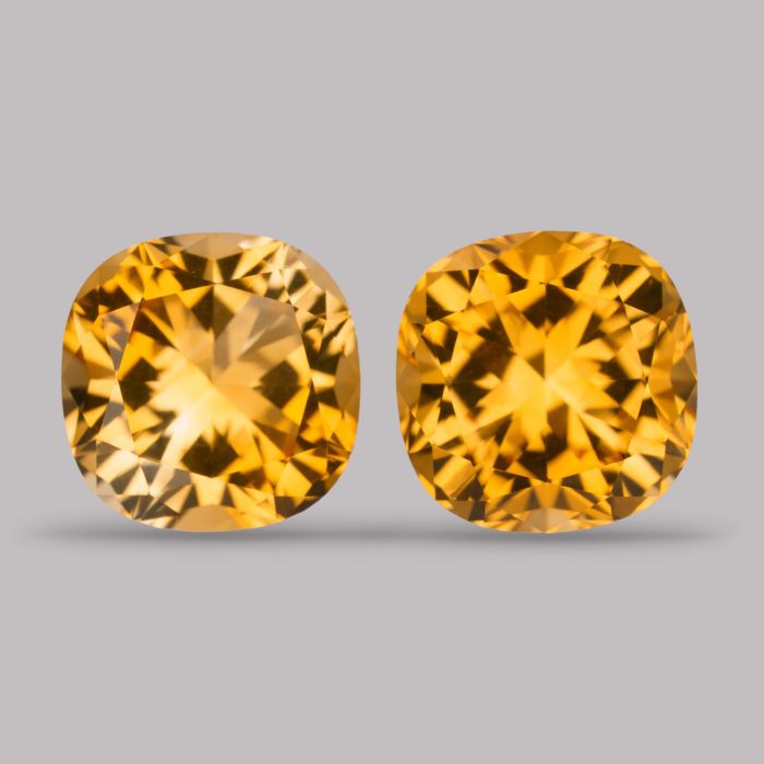 Пара цитринов в бриллиантовой огранке. Есть цветовая зональность, характерная для гретых камней.