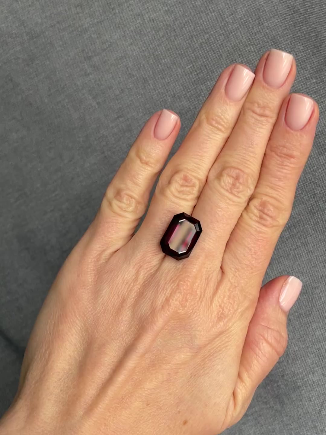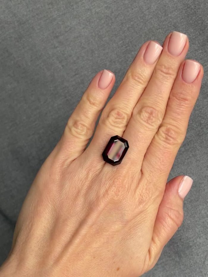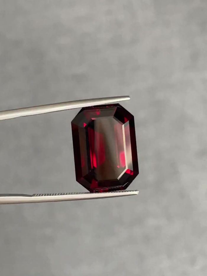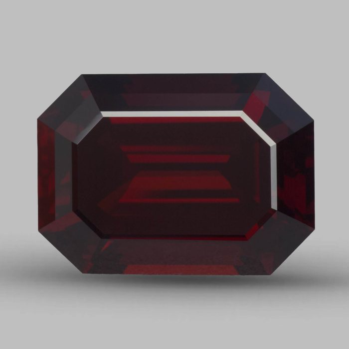 Крупный и чистый тёмный гранат в классической изумрудной огранке. В таком размере сырьё гранатов – уже редкость, даже в таком глубоком на грани черноты цвете.