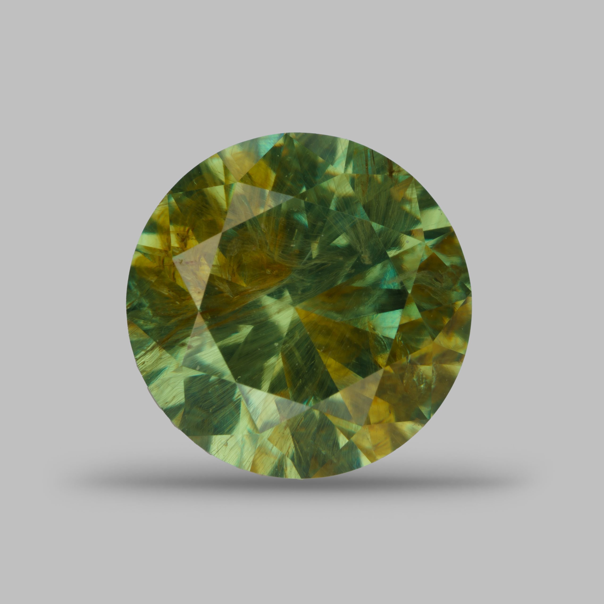 В этом камне аж несколько “хвостов” – включений биссолита, а ещё цветовая зональность. На фото всё это выглядит страшно, но вживую камень очень красивый, и довольно крупный для демантоида.