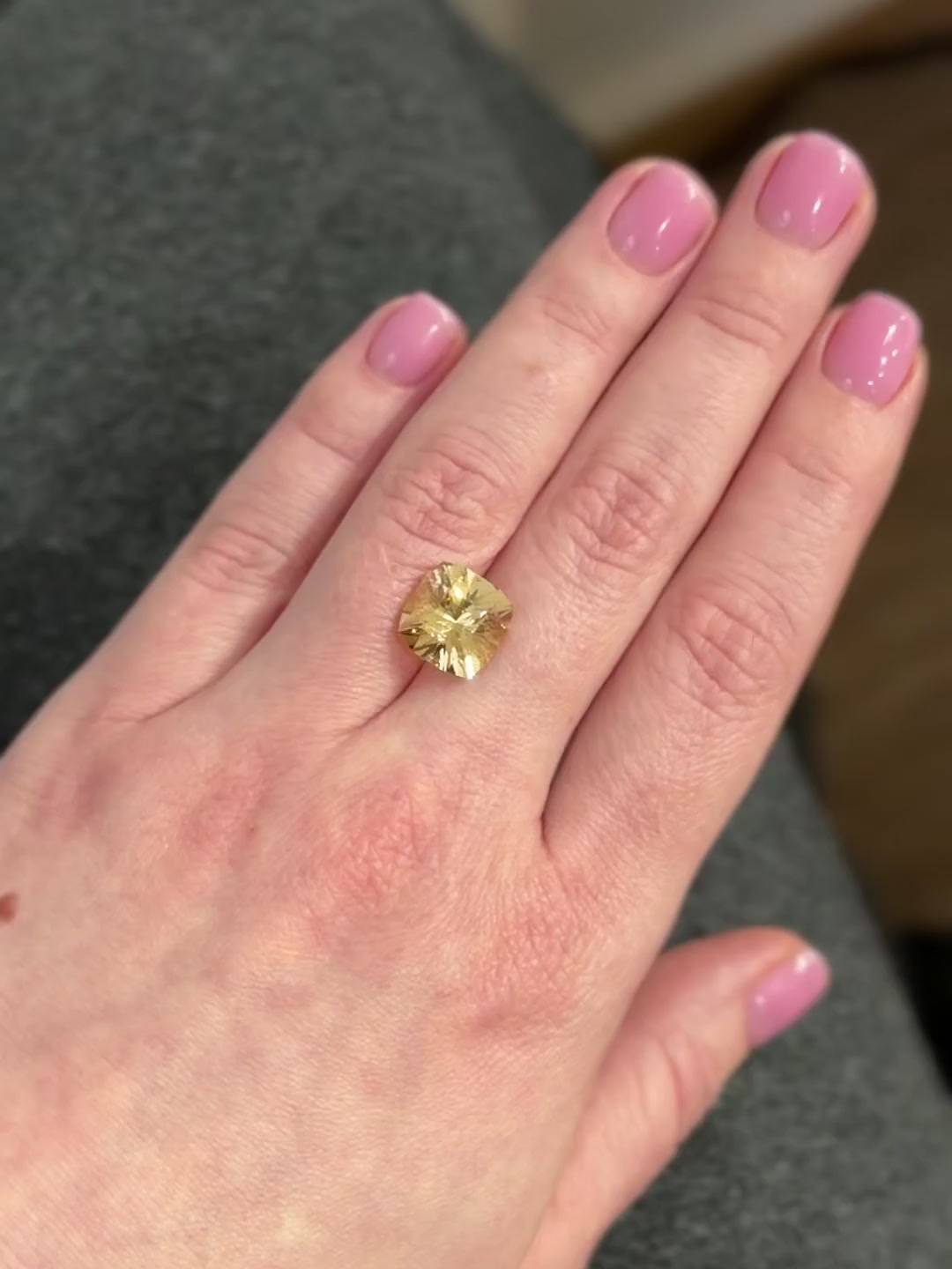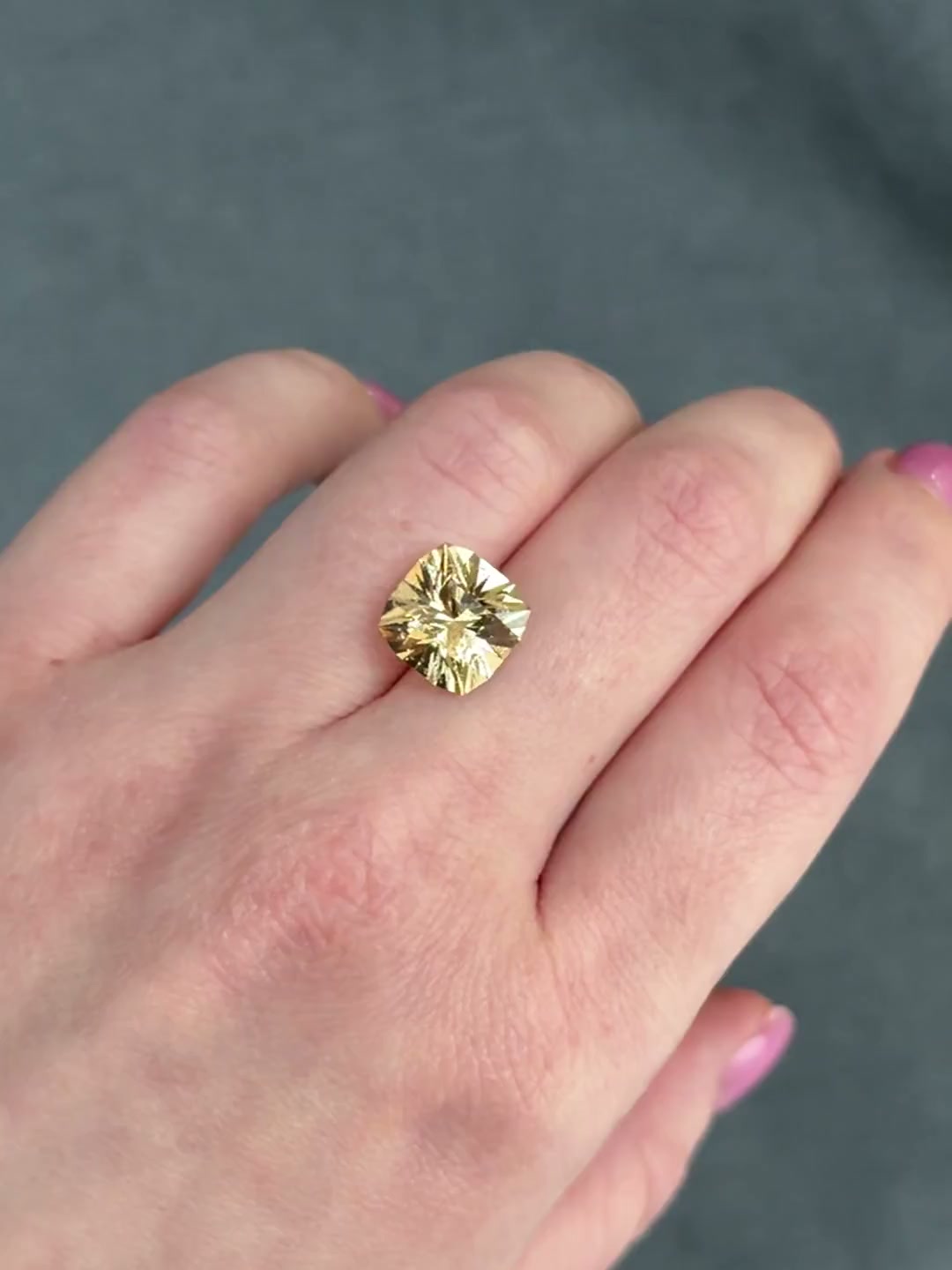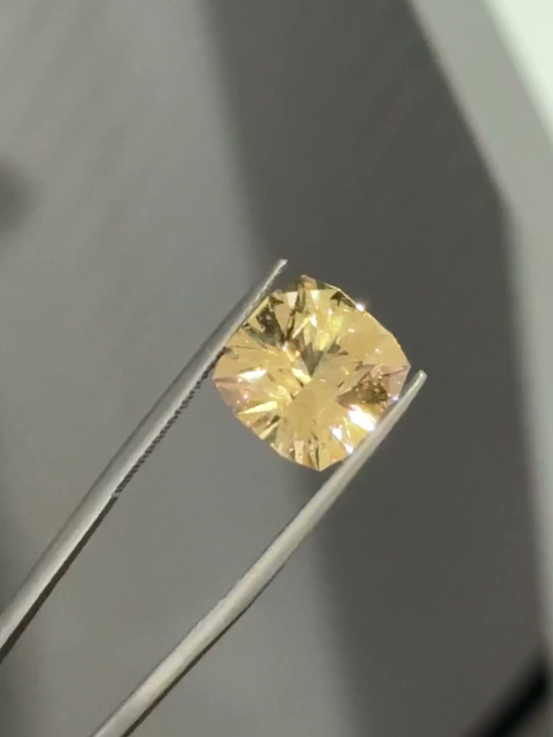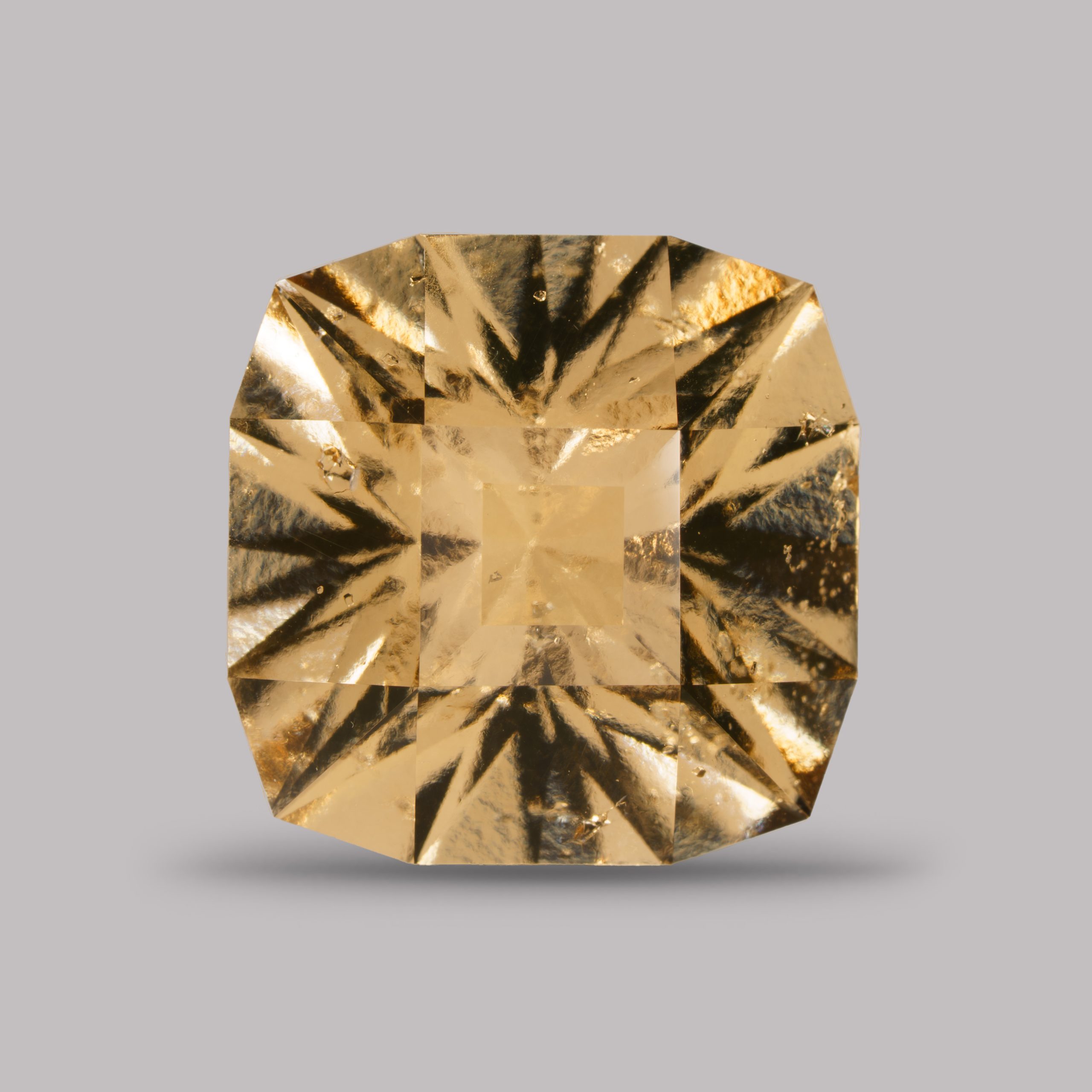 Гессонит редкого оттенка в фантазийной огранке. Есть внутренние включения, в том числе выходящие на поверхность, но не угрожающие целостности камня.