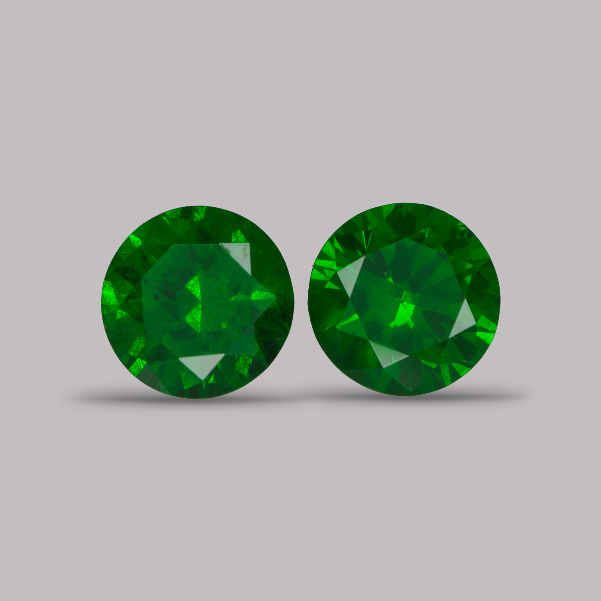 Пара уральских демантоидов выдающегося цвета, для заметных пусет. Небольшие включения видны на фото, но не глазом.