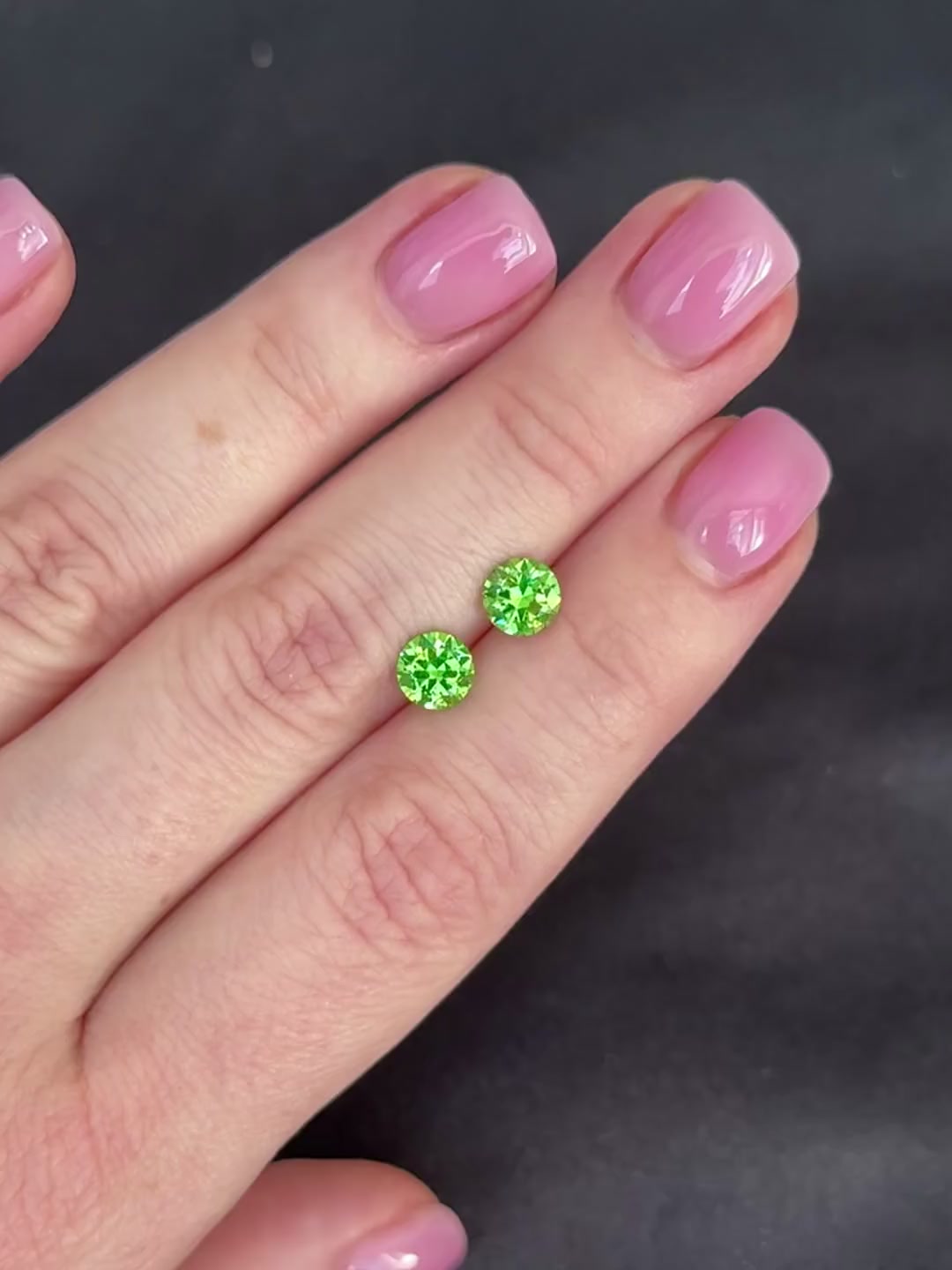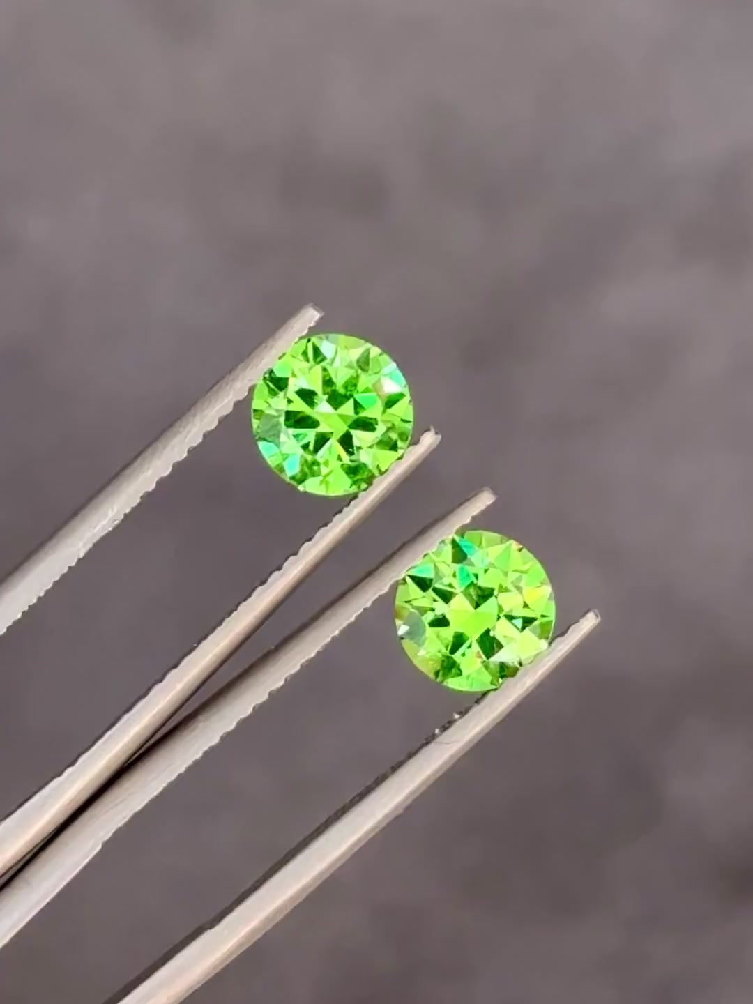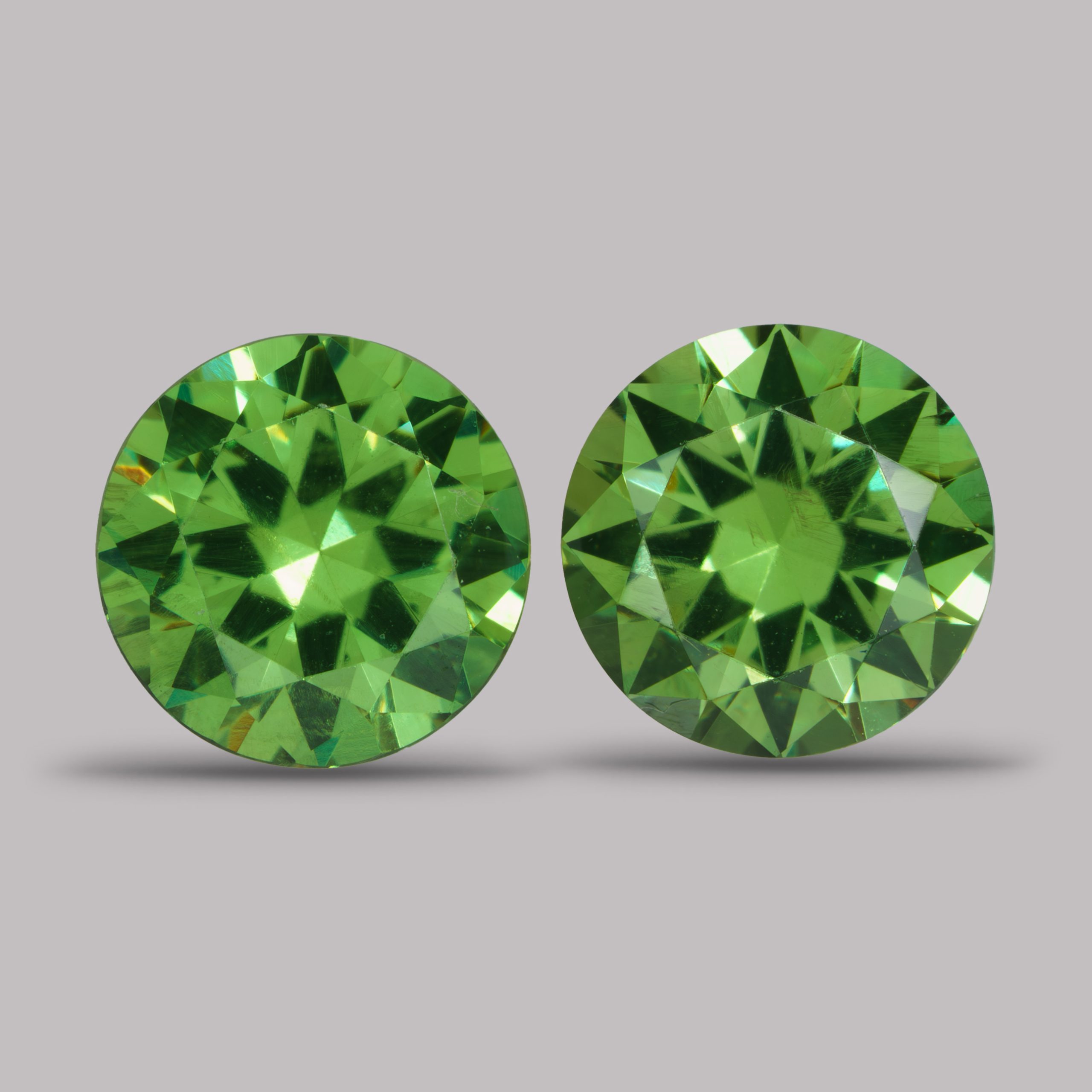 Пара зелёных гранатов больше карата каждый – по меркам Урала коллекционная редкость. Месторождение – Полдневская Бобровка (юг Свердловской области). Живой цвет, отличные дисперсия и блеск, впечатляющая для этого вида чистота.