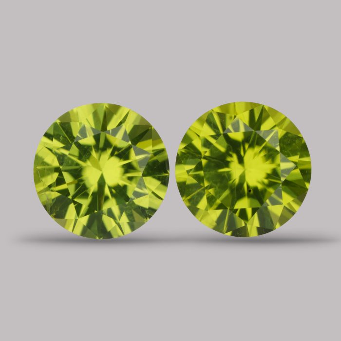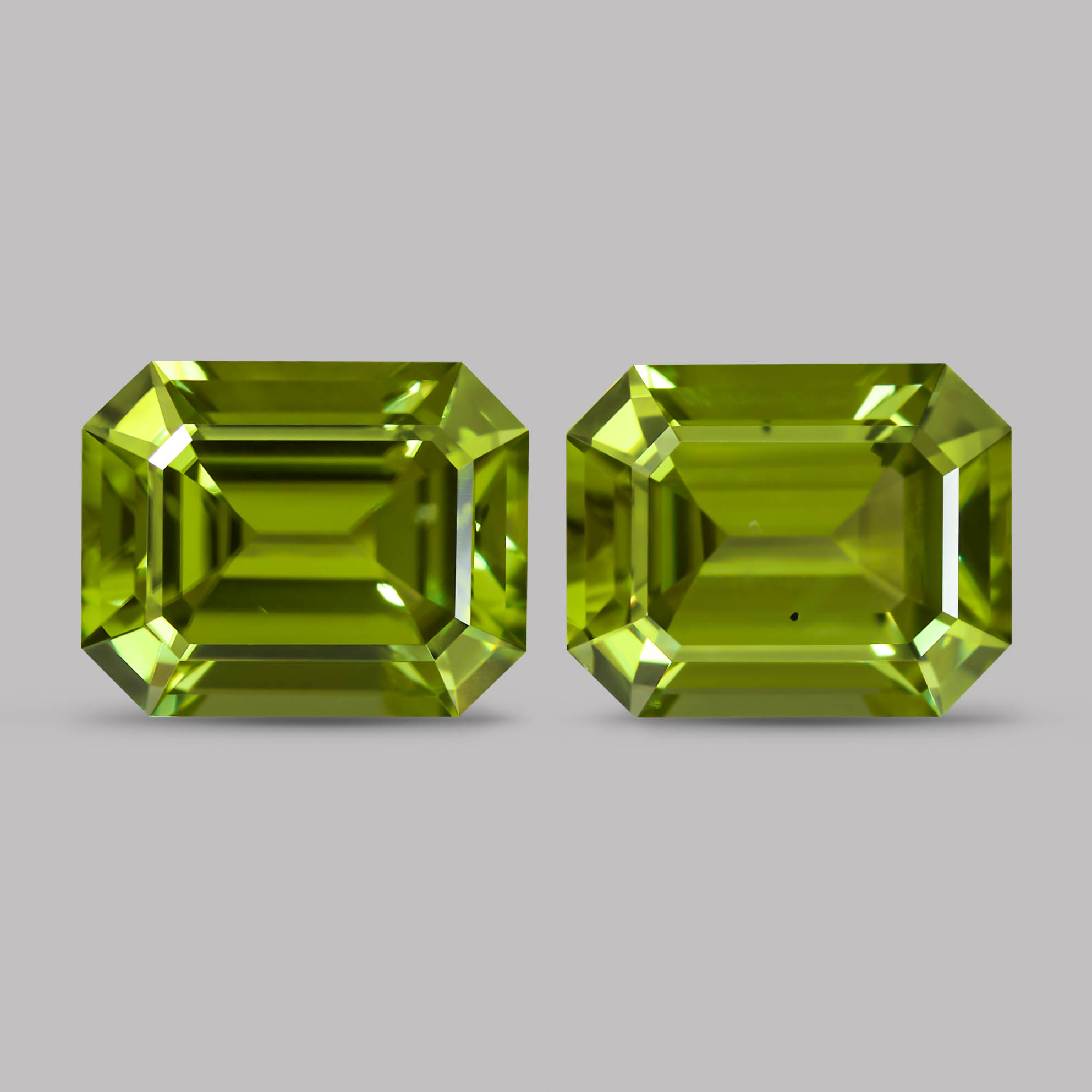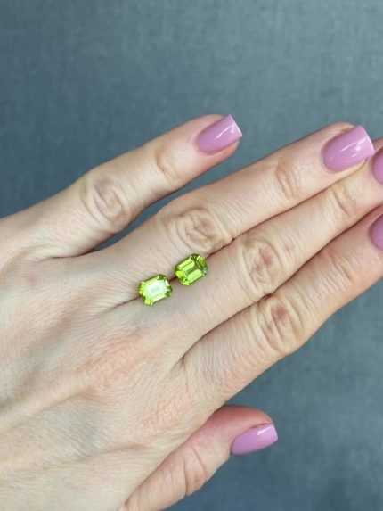 Пара насыщенных хризолитов (перидотов) с хорошей чистотой и без желтизны в бриллиантовой огранке.