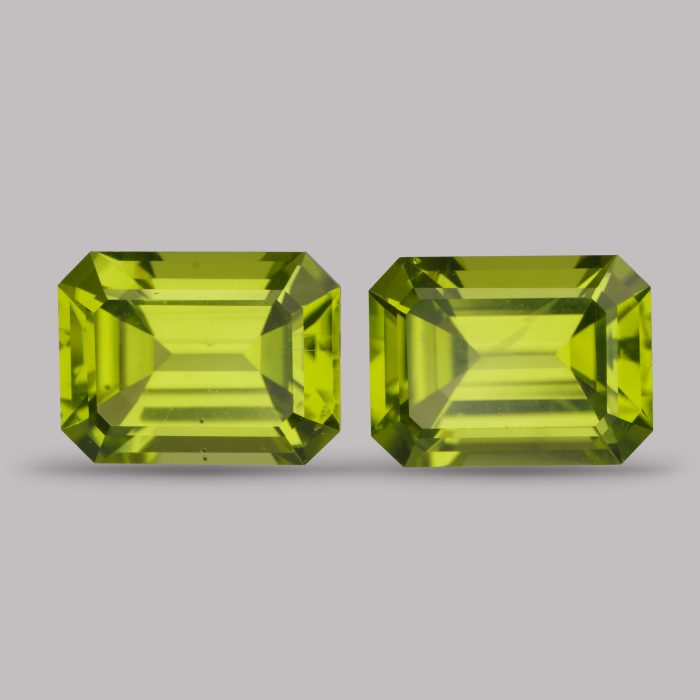 Пара желтовато-зелёных хризолитов в изумрудной огранке.