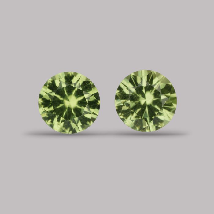 Редкие танзанийские хризолиты в бриллиантовой огранке, от большинства камней на рынке отличаются более мятным оттенком без желтизны.
