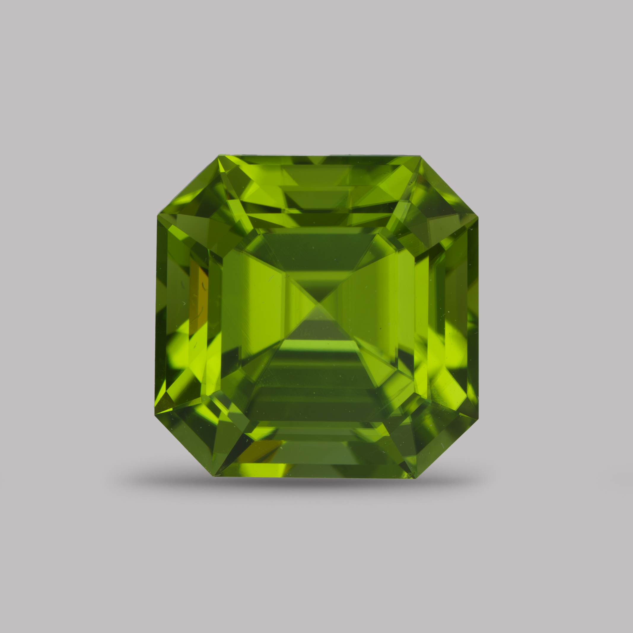 Крупный и чистый хризолит ашер. Оранжевая полоска слева – блик, сам камень чистого яблочного оттенка.