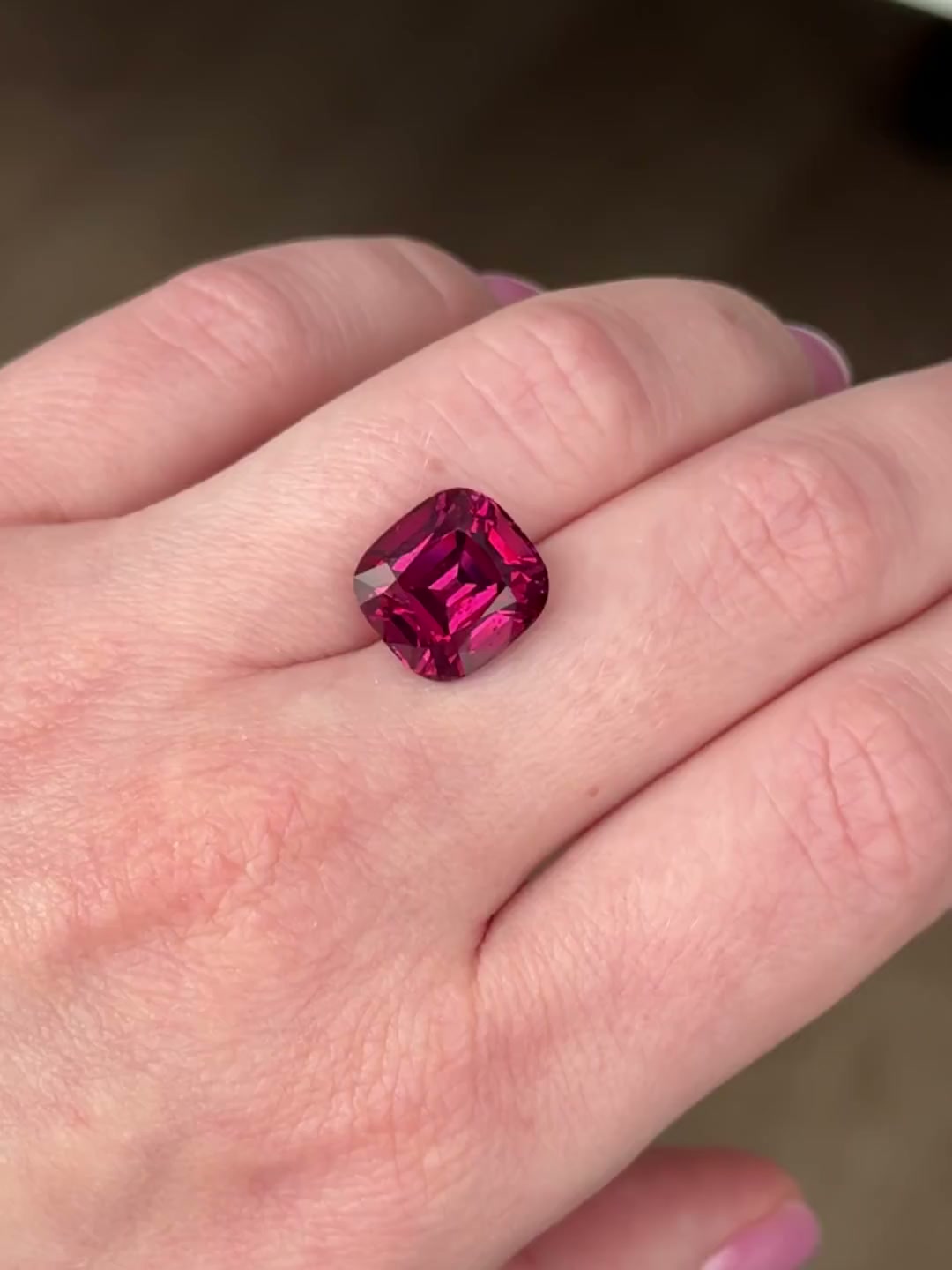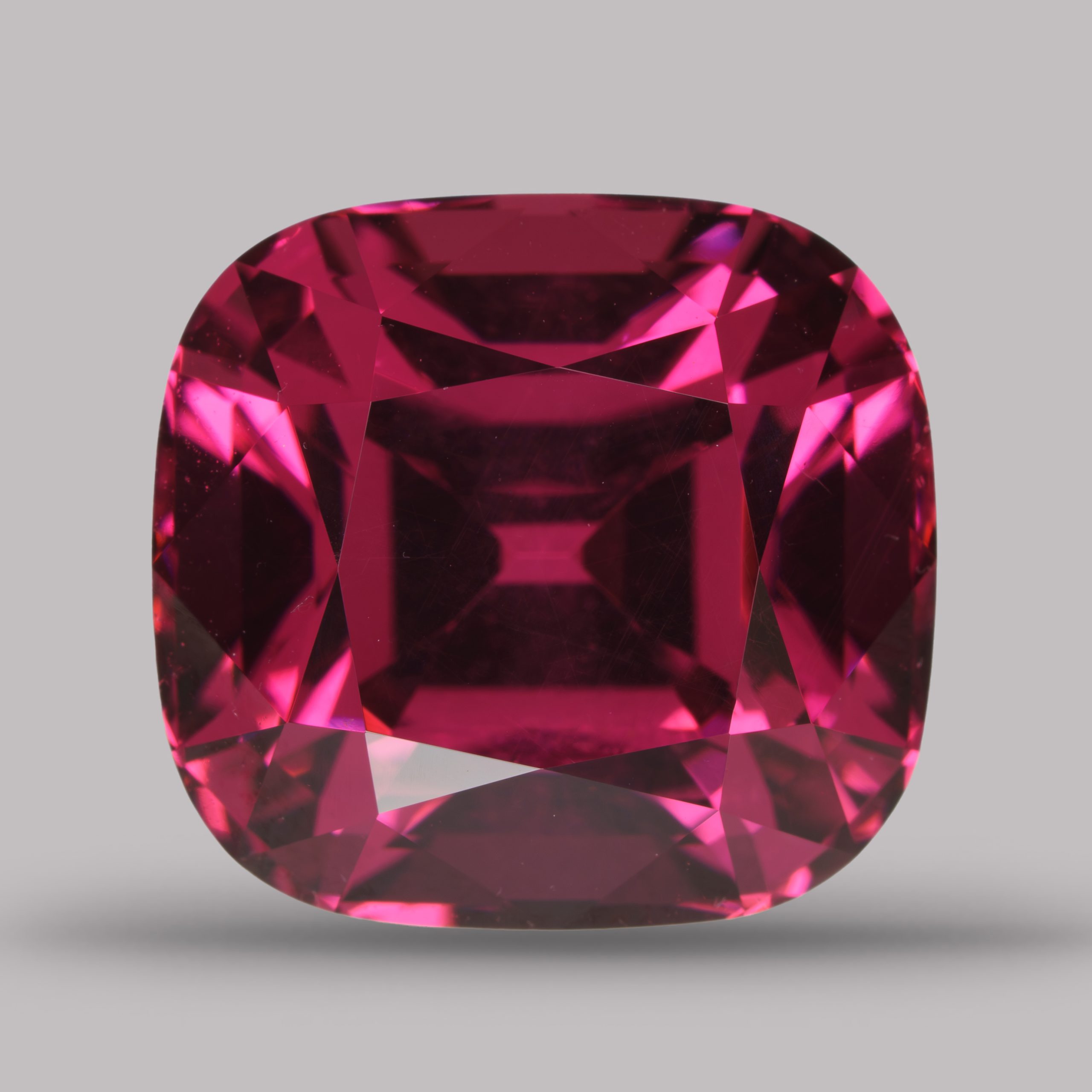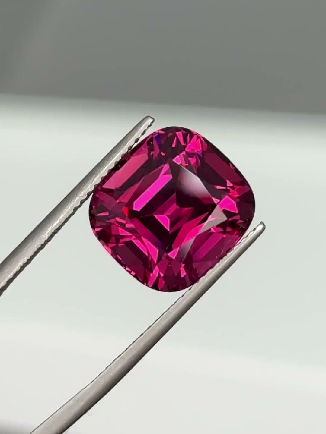 Выдающийся пурпурный родолит с идеальной чистотой. Он и в азиатской огранке был хорош, но для улучшения блеска и достижения симметрии мы переполировали его.