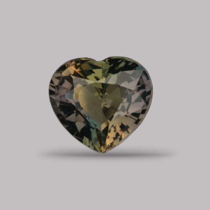 Необлагороженный сапфир с очень сложным цветом – синий, зелёный, жёлтый, розовый – он одновременно полихромный и меняет цвет на более ярко-пурпурный в тёплом электрическом свете.