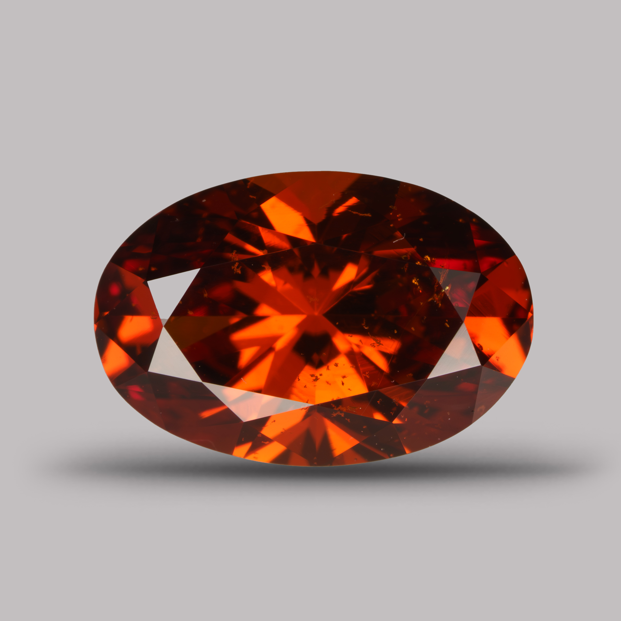 Яркий тёмно-оранжевый гранат пироп-спессартин, редкий в первую очередь благодаря происхождению: это Алданский район Якутии, россыпи реки Левый Нимгеркан. Для российского граната сочетание цвета и чистоты уникальное.