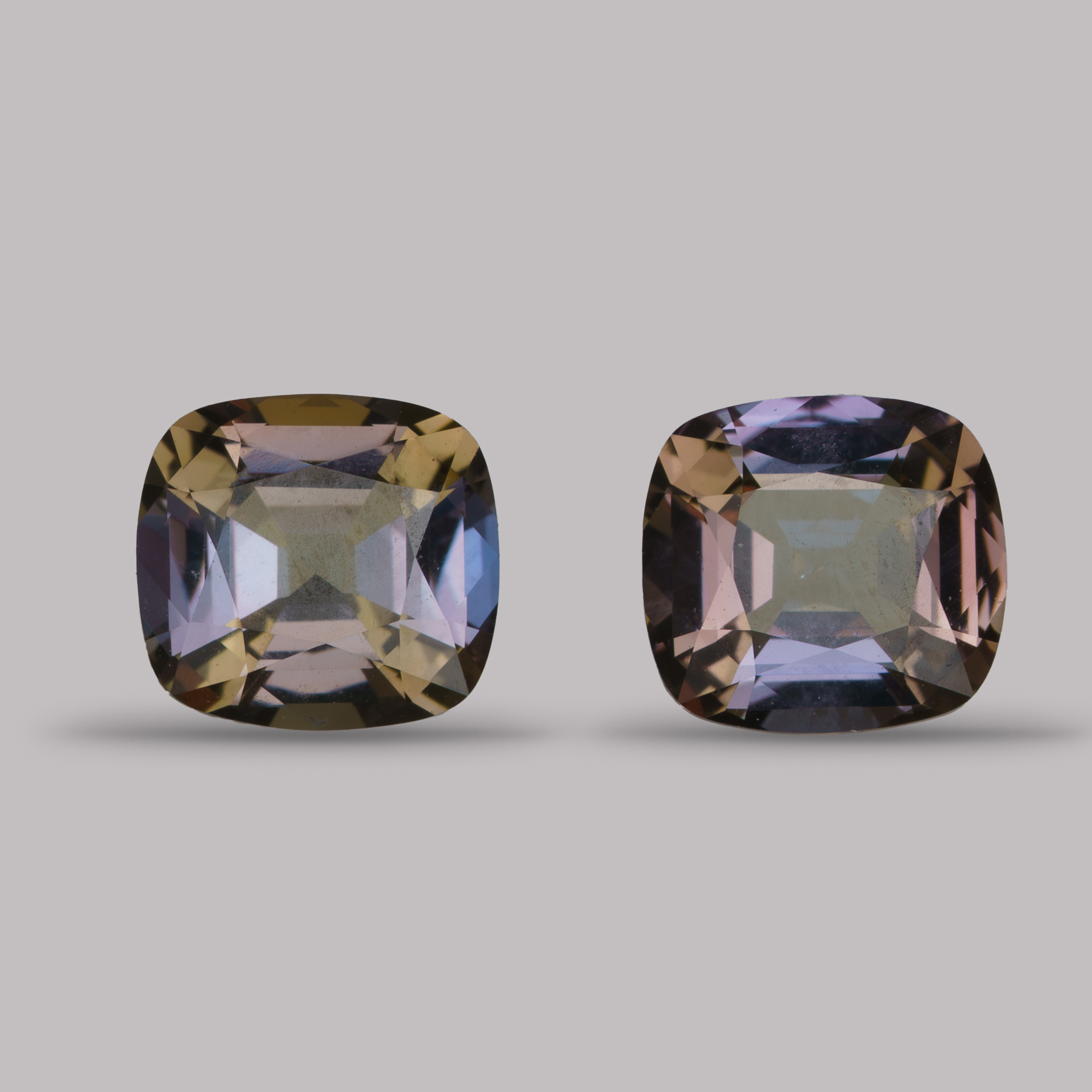 Пара камней с доминирующими фиолетовыми и коричневыми оттенками, но при вращении можно разглядеть жёлтый, розовый и даже синий.