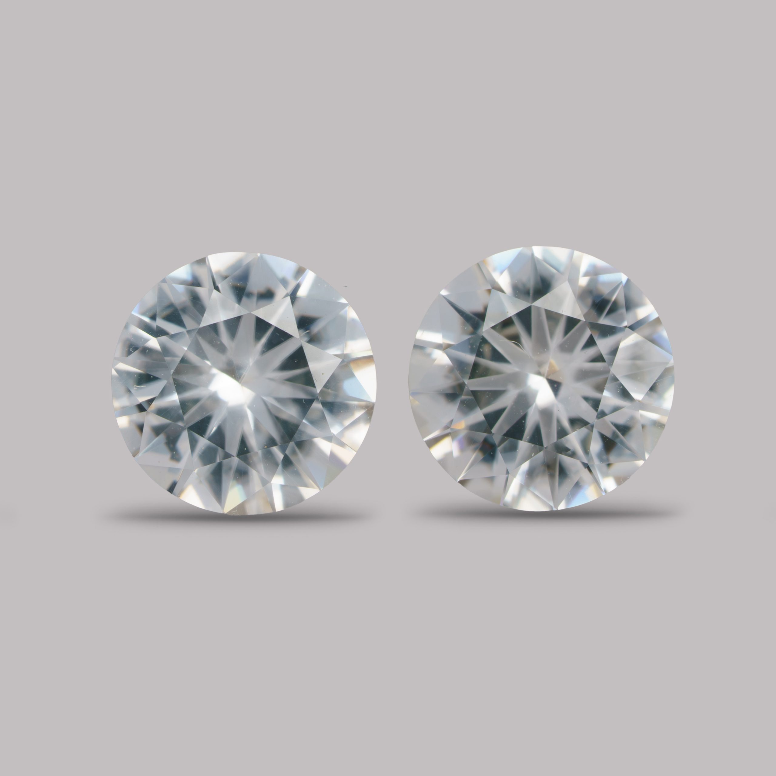 Пара бесцветных цирконов в круглой бриллиантовой огранке. Отлично смотрятся в софитах и на солнце.