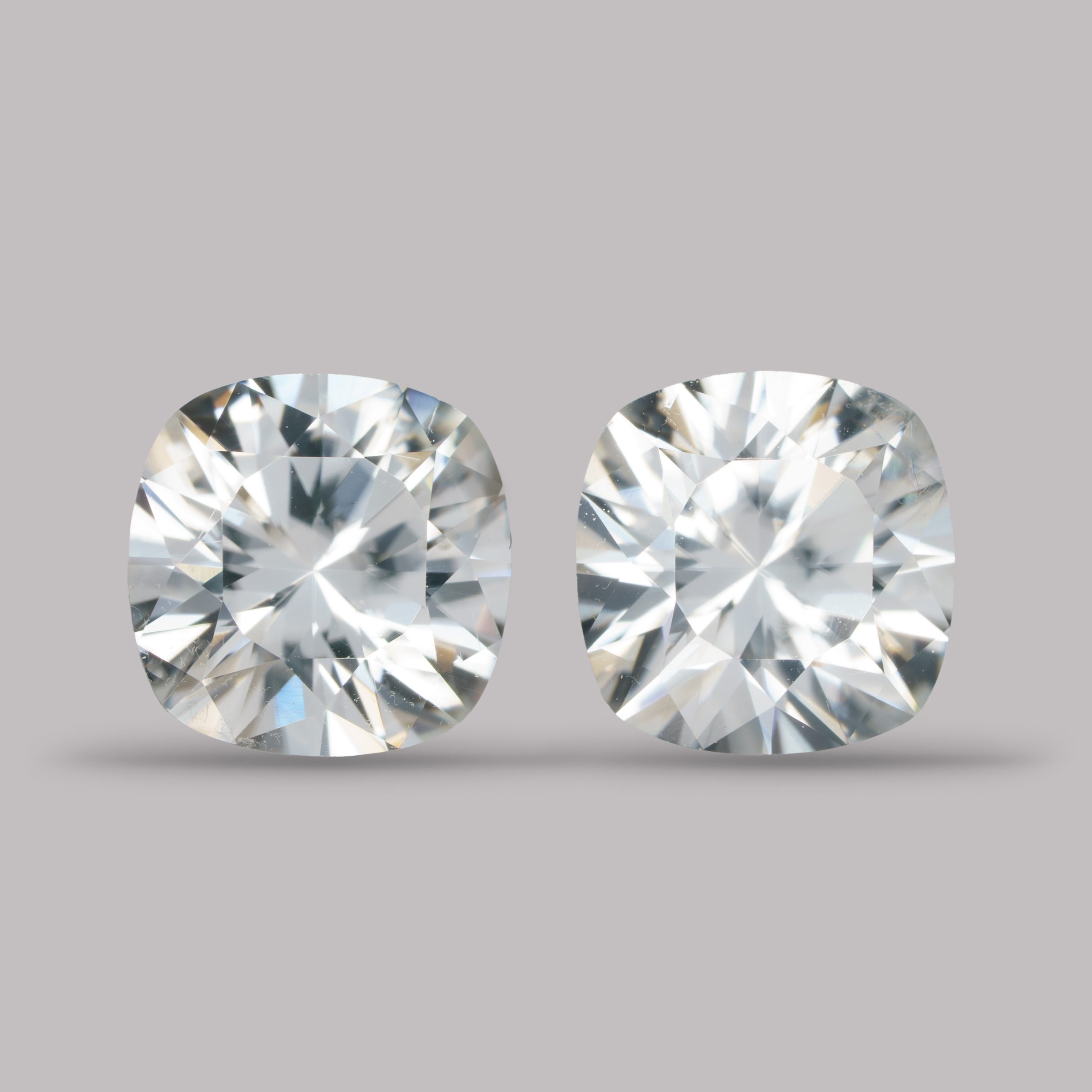 Пара бесцветных цирконов в бриллиантовой огранке. Природный циркон – не имитация бриллианта, а самостоятельный камень с отличной дисперсией.